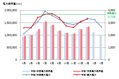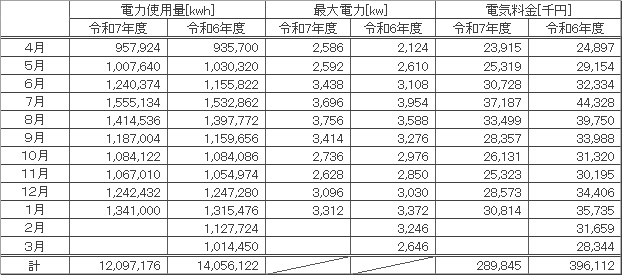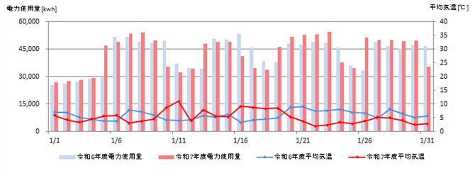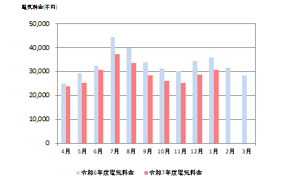 1月の気温は昨年度より全体的に低くなっており、下旬には平均気温が5℃を下回る日が多くありました。寒さによる暖房の稼働から、電力使用量も昨年度と比較して多くなっています。電気料金は令和7年4月に小売電気業者が変更になり、電気料金単価が安くなったことで、昨年度より約5,000千円の減少となりました。