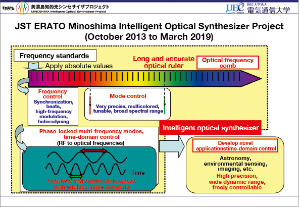 The intelligent optical synthesizer was selected as an Exploratory Research for Advanced Technology (ERATO) project by the Japan Science and Technology Agency (JST). The JST ERATO Minoshima Intelligent Optical Synthesizer Project, which will run from October 2013 to March 2019, aims to advance development of intelligent optical synthesizers and explore application fields. Specific fields being considered include astronomical observations, environmental sensing, and imaging.