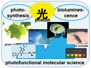 The research in photochemical science at our laboratory is characterized by a dual focus on two reactions: the light-emitting reactions (bioluminescence) of organisms and the reactions that take place when organisms are exposed to light (photosynthesis).