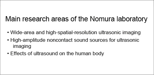The Nomura laboratory is presently engaged in main research areas (see Figure 3). One area is the development of technology for wide-area and high-spatial-resolution ultrasonic imaging. Another is the development of high-amplitude noncontanct sound source for applications in ultrasonic imaging and high power ultrasounds. The third area is analyses of the effects of ultrasounds on the human body.