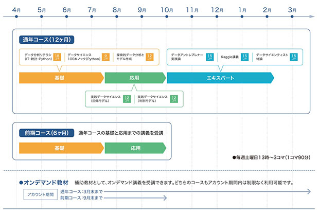 | 必修講義:(1)基礎レベル ・データ分析リテラシ(IT・統計・Python)【全18コマ】 ・データサイエンス100本ノック(Python)【全9コマ】 ・探索的データ分析とモデル作成【全12コマ】 データ分析に必須のリテラシおよびPythonの基礎とデータ分析を学びます。 必修講義:(2)応用レベル ・実践データサイエンス(回帰モデル)【全12コマ】 ・実践データサイエンス(判別モデル)【全12コマ】 実問題を対象にグループワークを通してモデル構築を学びます。 必修講義:(3)エキスパートレベル ・Kaggle講義【全15コマ】 ・データアントレプレナー実践論【全15コマ】 ・データサイエンティスト特論【全15コマ】 事例/提案力/表現力を学び実装力の徹底強化、プロジェクト推進を含む総合力を学びます。 |
