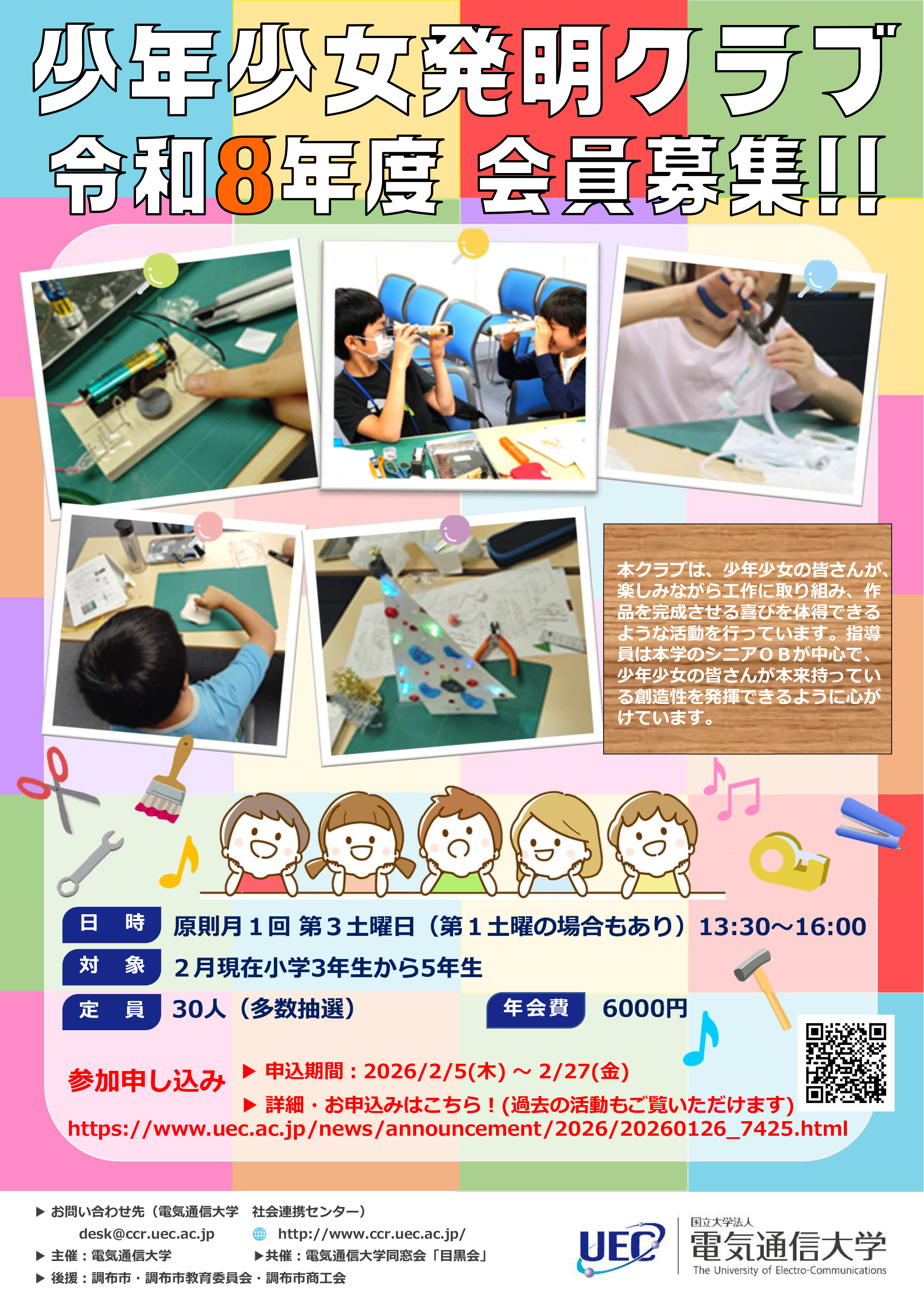 『調布少年少女発明クラブ』ではこのたび、2026年度(2026年4月から2027年3月まで)の会員を募集します。