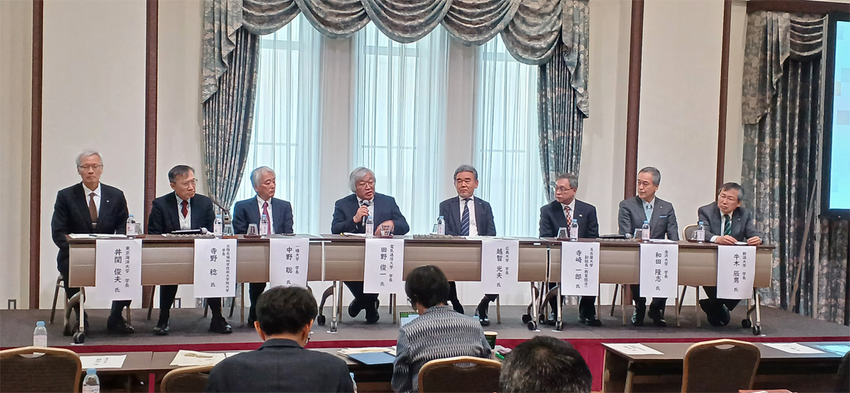 後半の部の総合質疑・意見交換セッションでは、牛木辰男新潟大学長、和田隆志金沢大学長、寺崎一郎名古屋大学副総長(教育担当)、越智光夫広島大学長、田野本学長、中野聡一橋大学長、寺野稔北陸先端科学技術大学院大学長、井関俊夫東京海洋大学長の8名が登壇し、FLAGs事業への思いやこれからの大学院教育、博士人材育成の取組等について、会場の参加者と質疑応答も交えながら活発な議論を行いました。