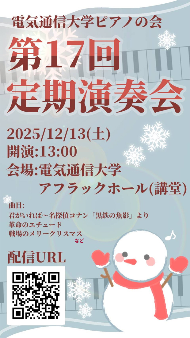 電気通信大学ピアノの会は、2025年12月13日(土)に電気通信大学アフラックホールUECにて、第17回定期演奏会を開催いたします。