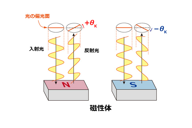 参考図表2:磁気光学カー効果の模式図。直線偏光を試料に当てた場合、N極で反射された光の偏光は時計回りにある角度θKだけ回転しますが、S極で反射された光は反時計回りに同じだけ回転します。この角度θKをカー角度と呼びます。なお、N極での反射時のカー角度が正になるか負になるかは物質や光の波長に依存します。