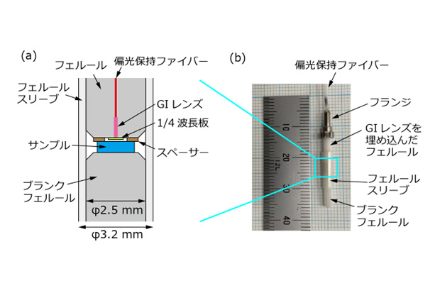 参考図表3:本研究で開発したパルス磁場下磁気光学カー効果測定用の試料固定部分。(a)が模式図で(b)は実際の写真。(a)に示すように、超小型のgradient index(GI)レンズをフェルールに埋め込んだものを利用しています。試料をフェルール同士でサンドイッチし、フェルールスリーブで高精度に固定することで、コンパクトでありながら安定的な磁気光学効果測定を可能としています。
