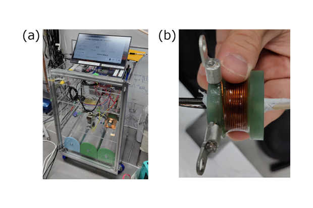 参考図表4:本研究で用いたポータブルパルス磁場発生装置。(a)装置全体の写真。電気通信大学の池田准教授のグループで作られたもので、電源やコンデンサ等が50センチメートル四方に収まるサイズに組み立てられています。このようにコンパクトでありながら、条件によって40テスラを超えるようなパルス磁場を発生させることが可能です。(b)パルス磁場発生用コイルの写真。