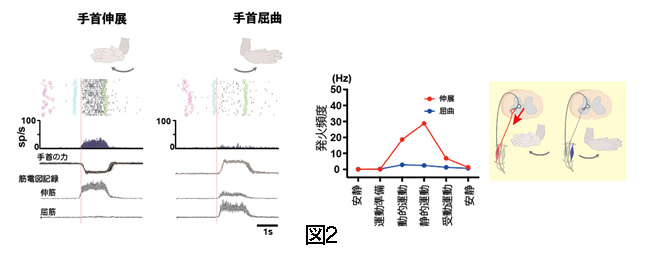 ポジティブフィードバックニューロンの手首屈曲伸展運動中の活動を比較すると(図2左)、手首伸展時に有意に高い活動頻度を示していました(図2右)。このことは、このニューロンの活動が、固有感覚入力を受けて、伸筋の活動の増加に使われている可能性を示していました。