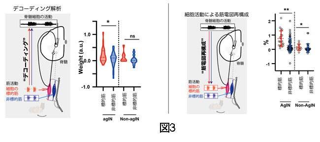ポジティブフィードバックニューロンの活動パターンは、そのニューロンの支配する筋活動によってより高く推定(デコーディング)することができ(図3左)、また個々のニューロンの活動によって同じ筋肉の活動をより高い貢献度で再構成できることが分かりました(図3右)。これらから、ポジティブフィードバックニューロンは同じ筋から入力を受け、同じ筋に出力するという回路特徴を持つだけでなく、実際の運動時にそれらの筋活動を作り出している事が証明されました。