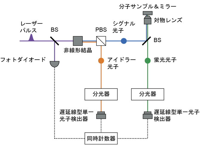 今回、研究チームは、既存の単一光子検出技術の範囲で実装可能な、量子もつれ光子対を利用した二次元蛍光分光法を理論的に提唱しました。本提案で想定する光学系の概略を図1に示します。まず、パルスレーザーを非線形結晶に入射し、自発的パラメトリック下方変換によって量子もつれ光子対を生成します。生成された光子対は偏光ビームスプリッター(PBS)で分離され、一方の光子(シグナル光子)は分子サンプルの励起に用いられます。サンプルから放出された蛍光光子と、もう一方の光子(アイドラー光子)との間で二光子同時計数検出を行います。ここで、遅延線型単一光子検出器と分光器を組み合わせることで、両光子の到着時刻と周波数を同時に計測します。