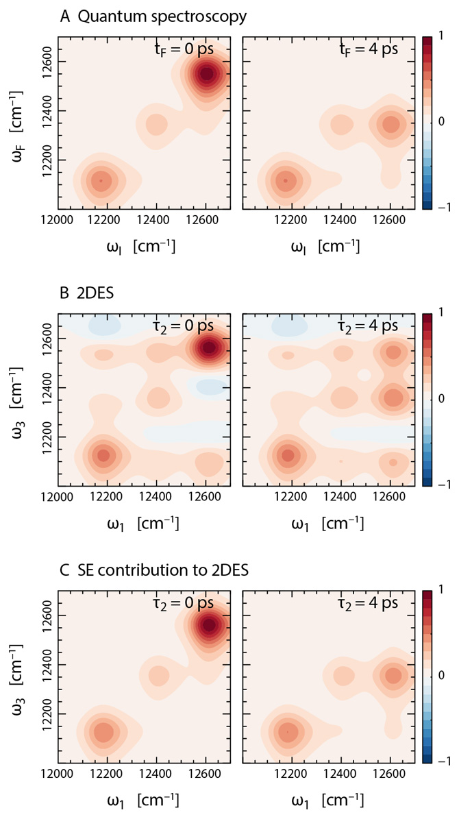 自発的パラメトリック下方変換で生成される量子もつれ光子対は、時間と周波数に関して強い量子相関をもっています。このため、検出したアイドラー光子の時間・周波数情報を手がかりに、サンプルを励起したシグナル光子の時間・周波数情報を再構成できます。その結果、従来の古典光による二次元分光法で必要だったような、複数の超短レーザーパルスの精密な遅延制御を行わなくても、二次元スペクトル情報を取得できる可能性が開かれます。これは、多次元分光装置の大幅な簡素化・小型化につながりうる点で重要です。さらに本提案は、信号検出が蛍光に基づくことから、従来の四光波混合による二次元分光計測で問題となりがちな、複数の非線形光学過程からの寄与が混在する状況に対して、誘導放出に相当する成分を選択的に引き出せます。これにより、図2に示すようにスペクトルのピーク形状が簡素化され、観測スペクトルから分子ダイナミクスに関する情報をより明瞭に抽出できることが期待されます。