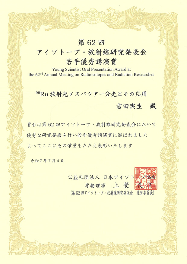 中村仁研究室の吉田実生さん(基盤理工学専攻博士後期3年)が、2025年7月2日(水)から7月4日(金)まで日本科学未来館で開催された第62回アイソトープ・放射線研究発表会で口頭発表し、若手優秀講演賞を受賞しました。
