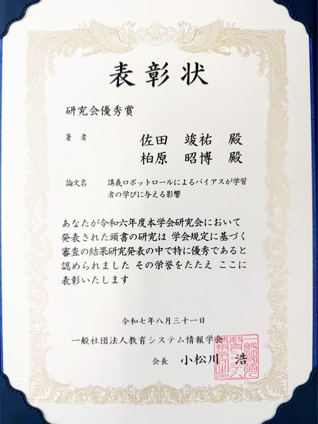 柏原昭博研究室の佐田竣祐さん(情報学専攻博士前期課程2024年度修了)と柏原昭博教授(情報学専攻)が、2025年8月31日(日)~9月1日(月)に早稲田大学で開催された第50回教育システム情報学会全国大会において、2024年度研究会優秀賞を受賞しました。