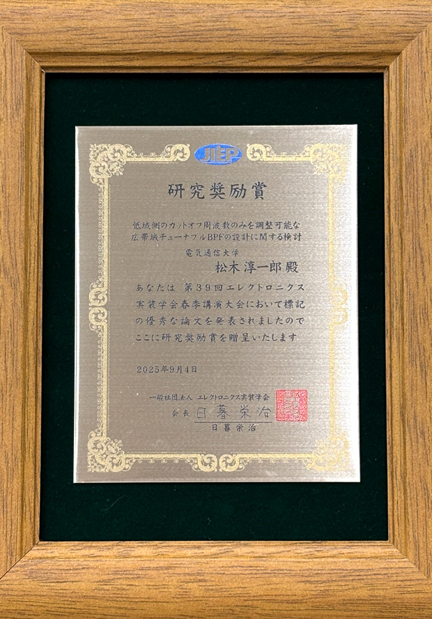 和田光司研究室の松木淳一郎さん(情報・ネットワーク工学専攻博士前期2年)が、2025年3月11日(火)~13日(木)に拓殖大学文京キャンパスにて開催された第39回エレクトロニクス実装学会春季講演大会において研究奨励賞を受賞しました。