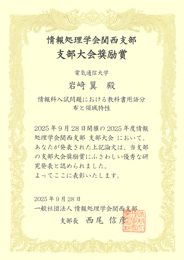 中山泰一研究室の岩﨑翼さん(情報・ネットワーク工学専攻博士前期2年)が、2025年9月28日(日)にオンラインで開催された2025年度情報処理学会関西支部支部大会において支部大会奨励賞を受賞しました。