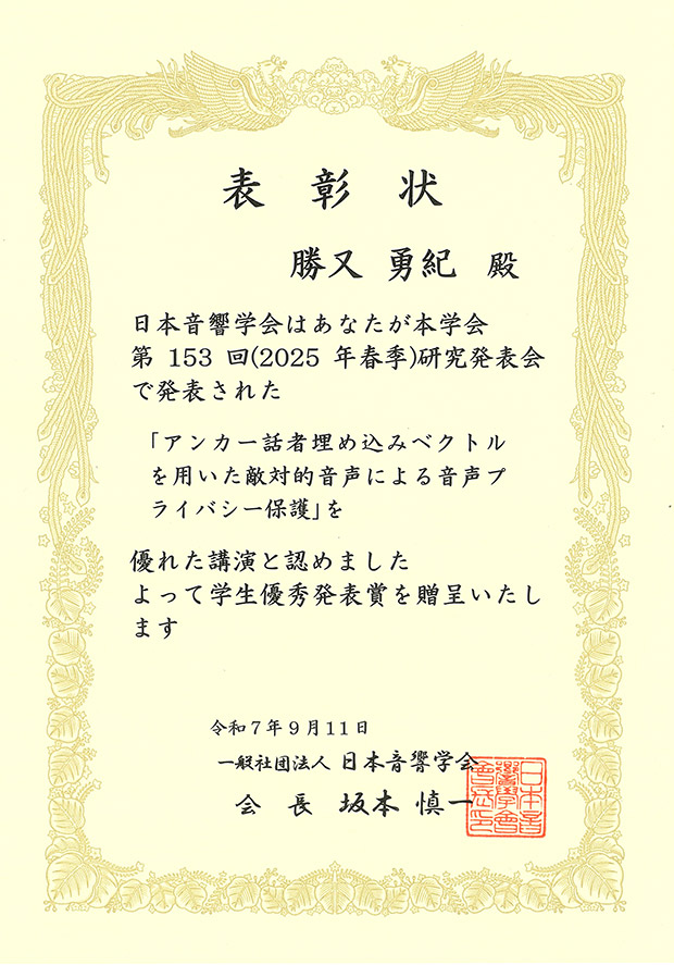 中鹿亘研究室の勝又勇紀さん(情報・ネットワーク工学専攻博士前期課程2025年3月修了)が、2025年3月17日(月)~19日(水)に埼玉大学で開催された日本音響学会153回(2025年春季)研究発表会で発表した講演で、2025年9月11日(木)に学生優秀発表賞が授与されました。
