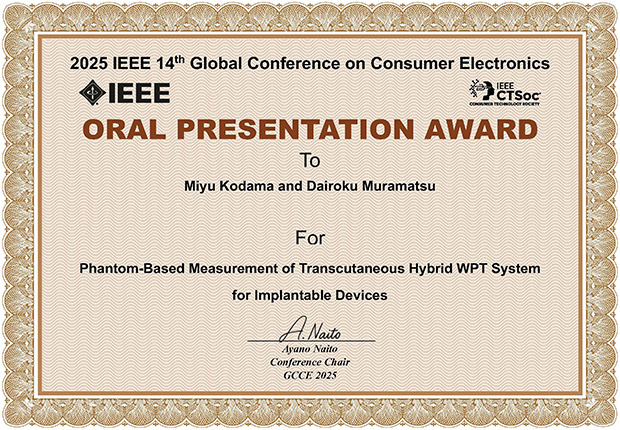 村松大陸研究室の小玉美悠さん(機械知能システム学専攻博士前期2年)と村松大陸准教授(機械知能システム学専攻)の共著論文が、2025年9月23日(火)~26日(金)に大阪国際会議場で開催されたIEEE 14th Global Conference on Consumer Electronics(GCCE 2025)において、Oral Presentation Awardを受賞しました。