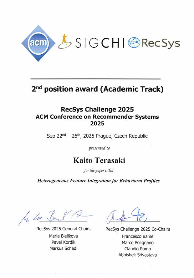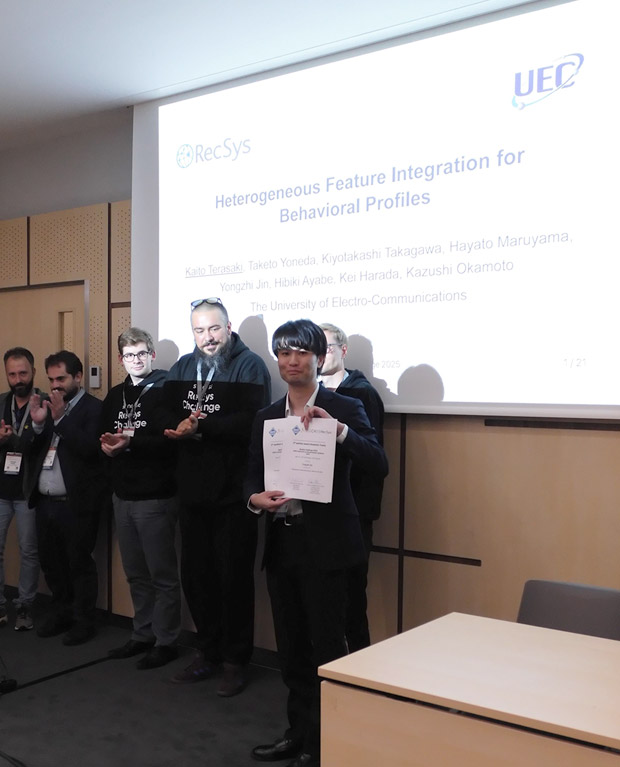 岡本一志研究室の寺崎海翔さん(情報学専攻博士前期2年)ら情報学専攻デザイン思考・データサイエンス(D×2(デンツー))プログラムのメンバーが中心となって構成されたチーム「UEC_bootcamp_2025」が、2025年3月10日(月)~6月30日(月)に開催された、推薦システム分野における国際学会19th ACM Conference on Recommender Systems(RecSys 2025)の公式コンペティションRecSys Challenge 2025にて、Academic部門で第2位、総合で第9位に入賞しました。