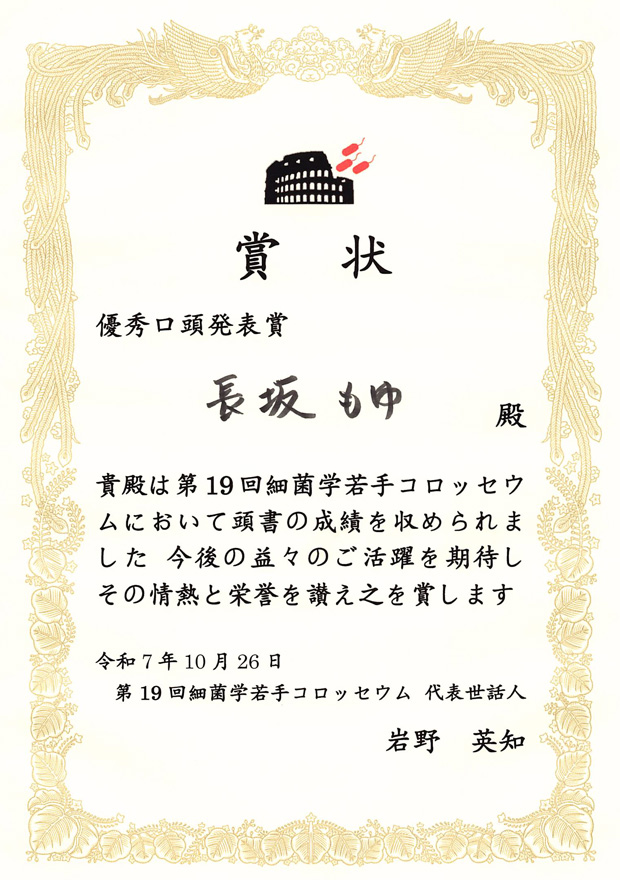 中根大介研究室の長坂もゆさん(基盤理工学専攻博士前期1年)が、2025年10月24(金)~26日(日)に酪農学園大学にて開催された第19回細菌学若手コロッセウムにおいて、優秀口頭発表賞を受賞しました。