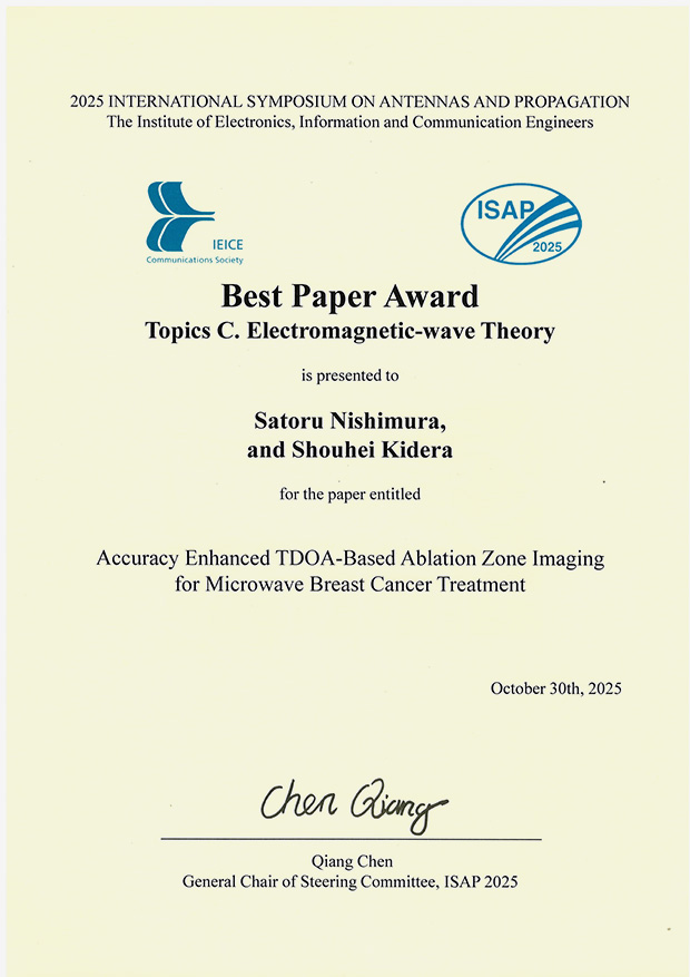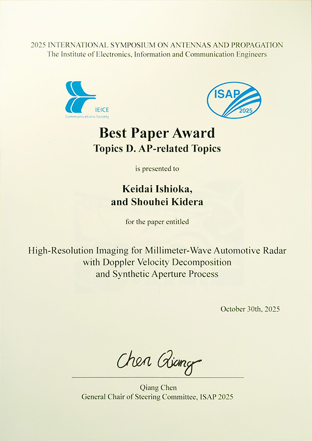 木寺正平研究室の石岡慧大さん(情報・ネットワーク工学専攻博士前期1年)と西村聡留さん(情報・ネットワーク工学専攻博士前期1年)および木寺正平教授(情報・ネットワーク工学専攻)の共著論文が、2025年10月27日(月)〜31日(金)に福岡市で開催された国際会議the 2025 International Symposium on Antennas and Propagation (ISAP2025)でBest Paper Awardを受賞しました。