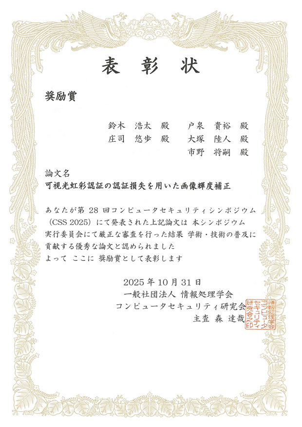 市野将嗣研究室の鈴木浩太さん(情報学専攻博士前期2年)らが、2025年10月27日(月)~10月31日(金)に、岡山コンベンションセンターとオンラインのハイブリッド形式で開催されたコンピュータセキュリティシンポジウム2025(CSS2025)において、CSS奨励賞を受賞しました。