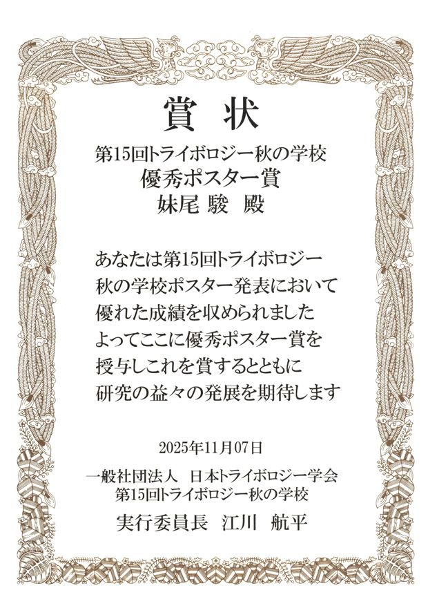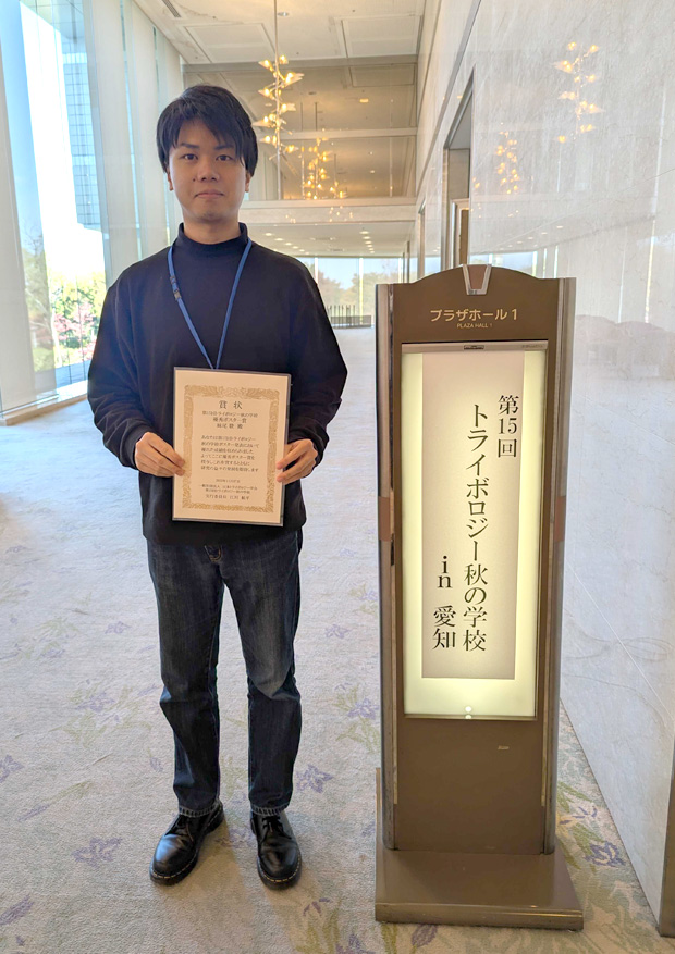 佐々木成朗研究室の妹尾駿さん(基盤理工学専攻博士前期1年)が、2025年11月6日(木)、7日(金)にあいち健康プラザで開催された日本トライボロジー学会 第15回トライボロジー秋の学校で優秀ポスター賞を受賞ました。