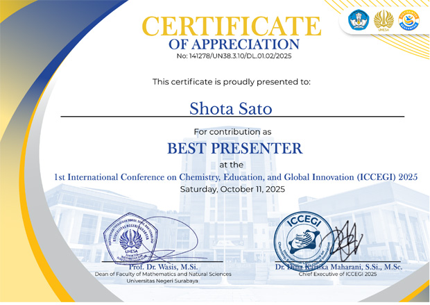 中村淳研究室のMUHAMMAD HASSANさん(基盤理工学専攻博士前期2年)と佐藤翔太さん(基盤理工学専攻博士後期2年)が、2025年10月11日(土)にインドネシアのSurabaya州立大学で開催された国際会議1st International Conference on Chemistry, Education, and Global Innovation(ICCEGI2025)においてBest presenterを受賞しました。