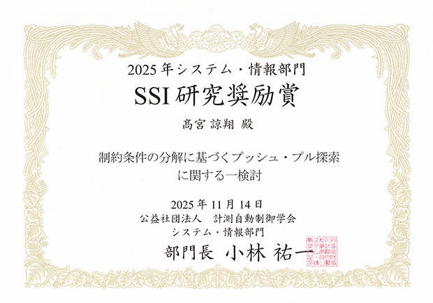 佐藤寛之研究室の高宮諒翔さん(情報学専攻博士前期2年)が、2025年11月12日(水)~14日(金)に、東北大学青葉山キャンパスで開催された計測自動制御学会システム・情報部門学術講演会(SSI2025)において、SSI研究奨励賞を受賞しました。