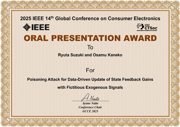 鈴木隆太さん(II類(融合系)計測制御プログラム4年)と金子修教授(機械知能システム学専攻)の共著論文が、2025年9月23日(火)~26日(金)に大阪国際会議場で開催されたIEEE 14th Global Conference on Consumer Electronics(GCCE 2025)において、Oral Presentation Awardを受賞しました。
