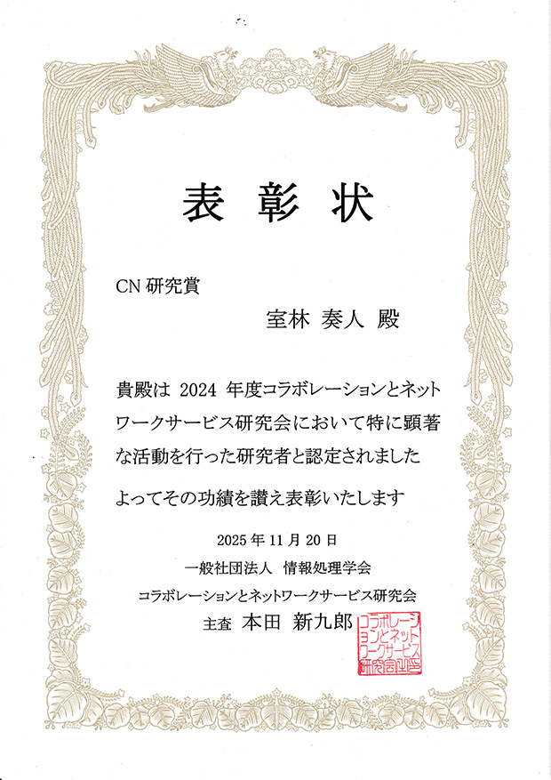 本賞は、情報処理学会コラボレーションとネットワークサービス研究会が主催する研究会、ワークショップ等で発表された論文のうち優秀なものを選定し、その発表者を表彰するものです。2024年度は81件の発表の中から、室林さんの発表が選ばれました。