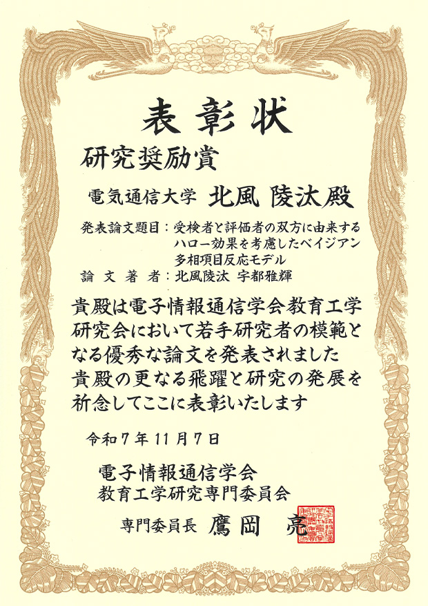 宇都雅輝研究室の北風陵汰さん(Ⅰ類(情報系)情報数理工学プログラム4年)が、2025年11月7日(金)に兵庫医科大学で開催された電子情報通信学会教育工学研究会で研究奨励賞を受賞しました。