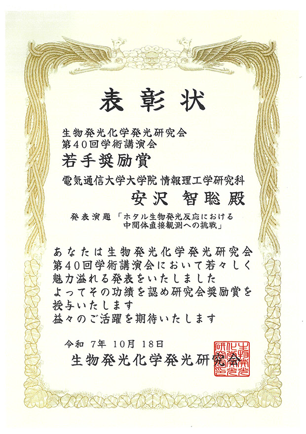 平野誉研究室の安沢智聡さん(基盤理工学専攻博士前期1年)は、2025年10月18日(土)に産業技術総合研究所・関西センターで開催された生物発光化学発光研究会第40回学術講演会のポスター発表にて、優秀学生発表の上位に授与される奨励賞を受賞しました。