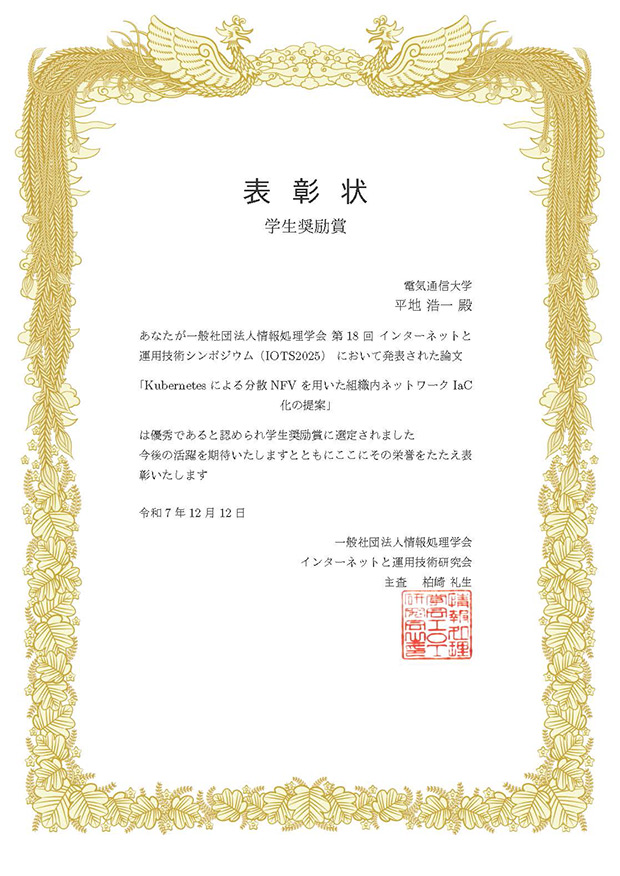 矢﨑俊志研究室の平地浩一さん(情報・ネットワーク工学専攻博士前期1年)が、2025年12月11日(木)、12日(金)に宮崎県アートホテル宮崎スカイタワーとオンラインとのハイブリッド形式で開催された、第18回インターネットと運用技術シンポジウム(IOTS2025)において、情報処理学会インターネットと運用技術研究会学生奨励賞を受賞し表彰されました。