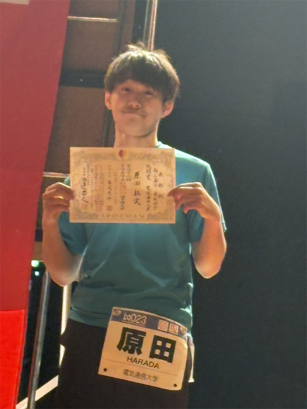 大学公認サークル スポーツチャンバラ同好会の渡辺謙信さん(Ⅰ類(情報系)1年)と原田拓実さん(Ⅲ類(理工系)1年)が、2025年12月13日(土)、14日(日)に開催された日本スポーツチャンバラ学生連盟主催「第32回スポーツチャンバラ全日本学生選手権大会」に出場し、渡辺さんは新人男子小太刀で優勝およびグランドチャンピオン戦に出場、原田さんは新人男子長剣両手で敢闘賞を受賞しました。