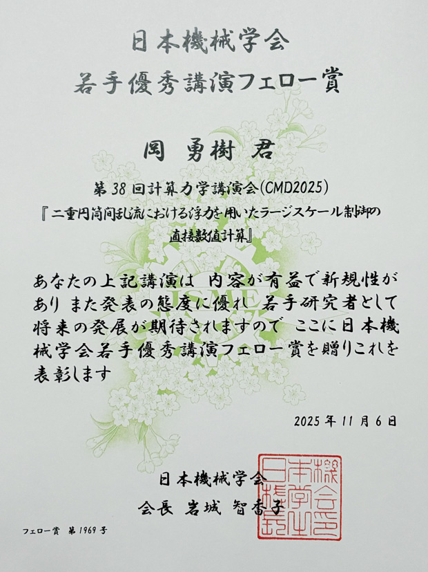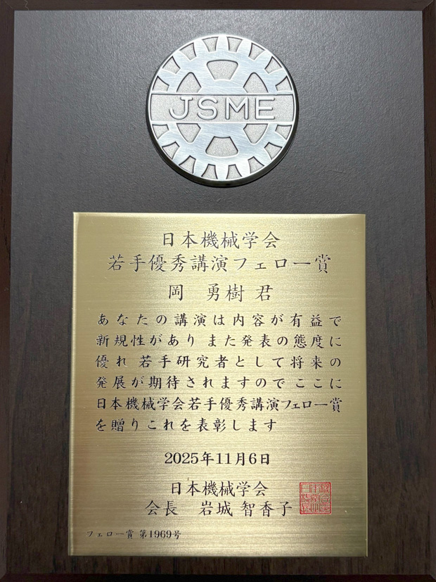 守裕也研究室の岡勇樹さん(機械知能システム学専攻博士前期2年)が、 2025年9月24日(水)~26日(金)に信州大学工学部で開催された日本機械学会 第38回計算力学講演会(CMD2025)において、岡さんの発表とその内容が評価され、2025年11月6日(木)に若手優秀講演フェロー賞を受賞しました。