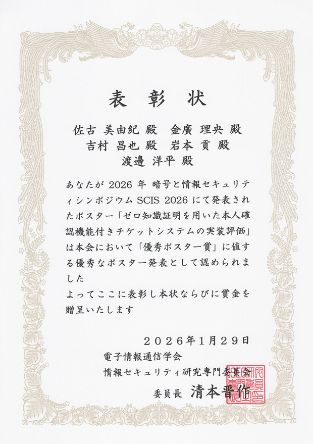 2026年1月26日(月)~30日(金)に函館アリーナ(北海道)にて開催された2026年 暗号と情報セキュリティシンポジウム(SCIS 2026)にて、岩本・渡邉研究室の佐古美由紀さん(情報学専攻博士前期1年)、金廣理央さん(情報学専攻博士前期2年)、吉村昌也さん(情報学専攻博士前期1年)、岩本貢教授(情報学専攻)、渡邉洋平准教授(情報学専攻)が発表したポスターがSCIS優秀ポスター賞を受賞しました。