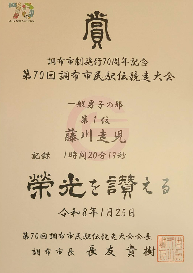 本学学生のチームが、2026年1月25日(日)に味の素スタジアム・都立武蔵野の森公園特設周回コースにて開催された、第70回調布市民駅伝競走大会一般男子の部にて1位を獲得しました。