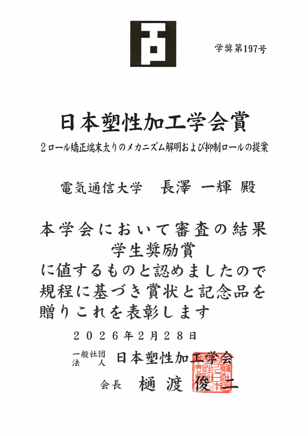 久保木孝研究室の長澤一輝 さん(機械知能システム学専攻博士前期2年)が、2026年2月28日(土)に一般社団法人日本塑性加工学会2025年度日本塑性加工学会賞 学生奨励賞を受賞しました。