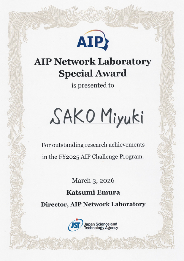 岩本貢・渡邉洋平研究室の佐古美由紀さん(情報学専攻博士前期1年)が、2026年3月2日(月)、3日(火)にL stay & grow 南砂町で開催されたAIPチャレンジプログラム成果発表会において、AIPネットワークラボ特別賞(AIP Network Laboratory Special Award)を受賞しました。