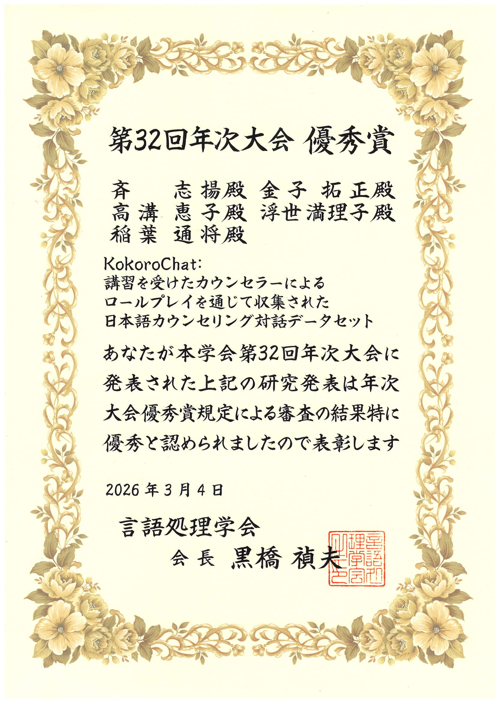 稲葉通将研究室のQI ZHIYANGさん(情報学専攻博士後期3年)が2026年3月9日(月)~13日(金)にライトキューブ宇都宮とオンラインのハイブリッド形式で開催された言語処理学会第32回年次大会(NLP2026)において、優秀賞を受賞しました。