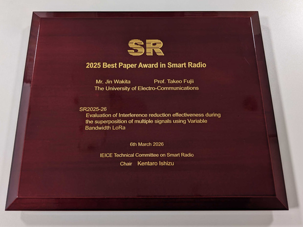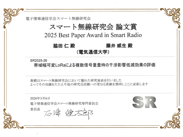 脇田仁さん(情報・ネットワーク工学専攻博士前期1年)と藤井威生教授(先端ワイヤレス・コミュニケーション研究センター)が、2026年3月6日(金)に2025年電子情報通信学会スマート無線研究会論文賞を受賞しました。