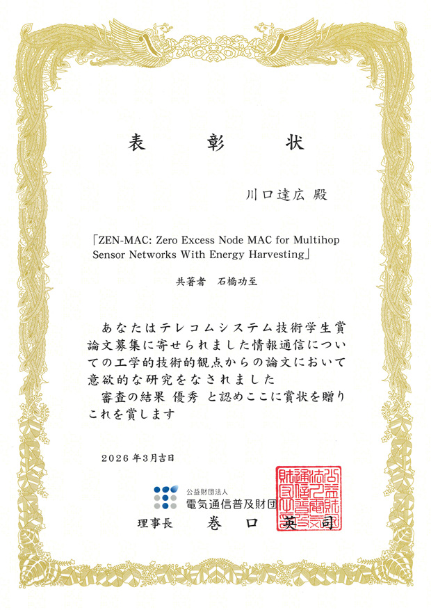 石橋功至研究室(先端ワイヤレス・コミュニケーション研究センター)の川口達広さん(情報・ネットワーク工学専攻博士後期3年)が執筆した論文が、2026年3月26日(木)に第41回電気通信普及財団賞テレコムシステム技術学生賞を受賞しました。