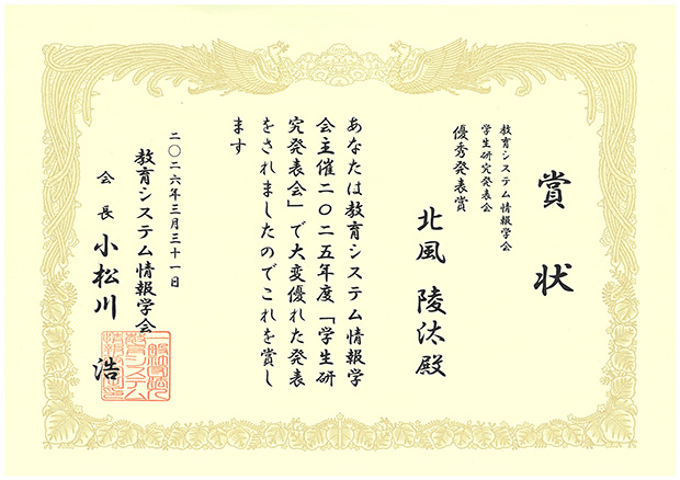 宇都雅輝研究室の北風陵汰さん(Ⅰ類(情報系)情報数理工学プログラム4年)が、2026年2月27日(金)に電気通信大学にて開催された教育システム情報学会2025年度学生研究発表会(関東地区)において、優秀発表賞を受賞しました。