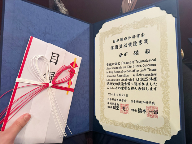辛川領客員教授(脳・医工学研究センター/公益財団法人がん研究会 有明病院形成再建外科 医長)が、2026年4月22日(水)~24日(金)にあわぎんホール(徳島)他で開催された第69回日本形成外科学会総会・学術集会において、2025年11月に発表した『Impact of Technological Advancements on Short-term Outcomes in Flap Reconstruction after Soft Tissue Sarcoma Resection: A Retrospective Comparative Analysis』の論文業績が評価され2025年度学術奨励賞優秀賞を受賞しました。