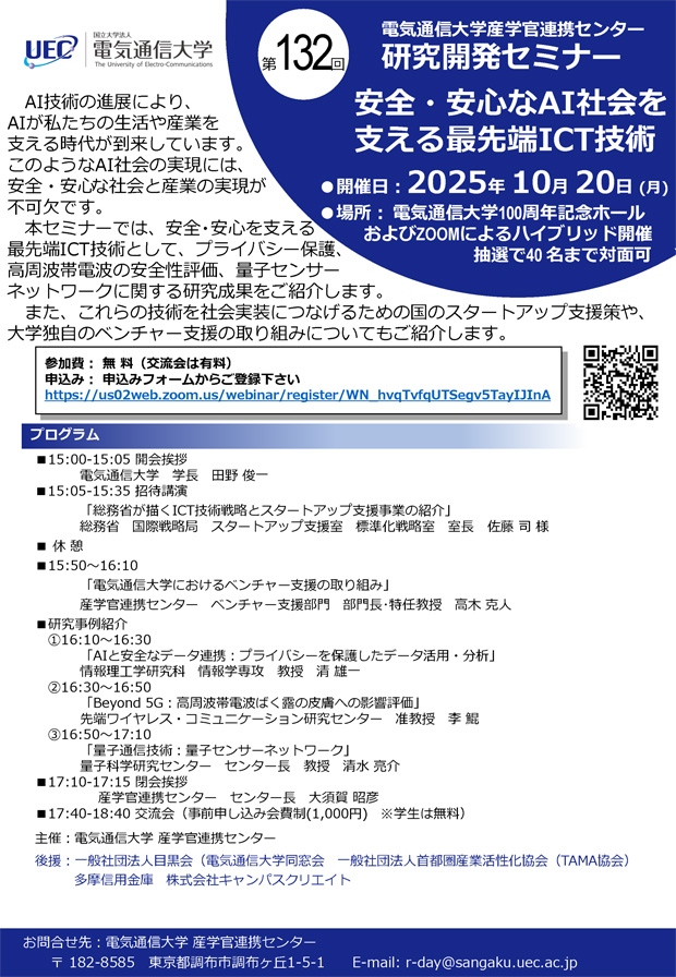 | 問い合わせ窓口 | 電気通信大学産学官連携センター メールアドレス:r-day@sangaku.uec.ac.jp |
