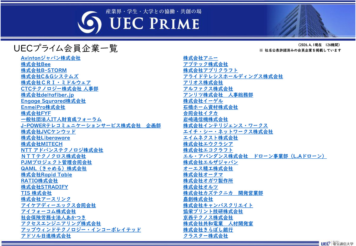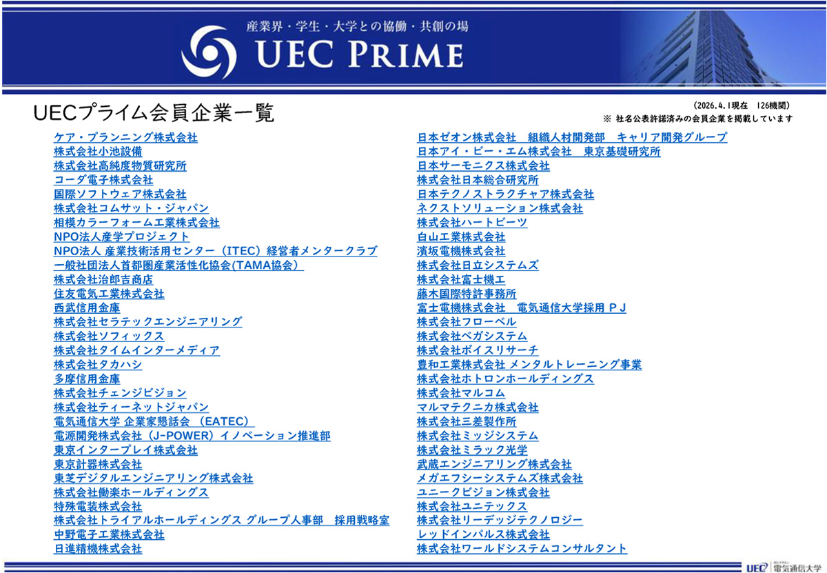 本学は、大学の知の社会実装と高度人材の輩出を推進する産学連携の好循環を実現することを目的として、産学連携会員組織「UECプライム」を設立することといたしました。